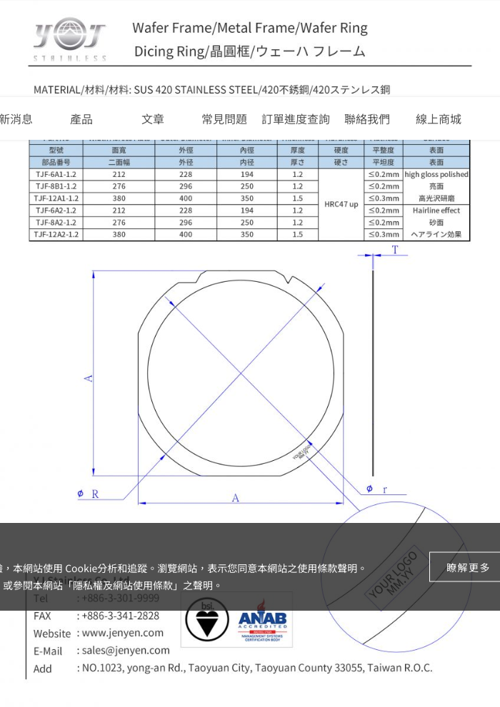 ウェハーフレーム、ダイシングフレーム(Wafer Frame)は、ウェハーリング、鉄リング、鉄圈(Wafer Ring)とも呼ばれ、主な用途は以下の通りです。 半導体用のウェハーリング / ステンレス製鉄リング / 鉄圈は、ウェハーの切断、研磨時にウェハーを固定して保持するために使用される外枠(フレーム)です。薄膜を貼り付け、ウェハーが切断・研磨の過程で滑り落ちるのを防ぎます。一度限りの使用ではない製品で、洗浄後に繰り返し使用できます。関連製品ブランドの中では、ディスコリング(鉄リング)が最も有名です。
