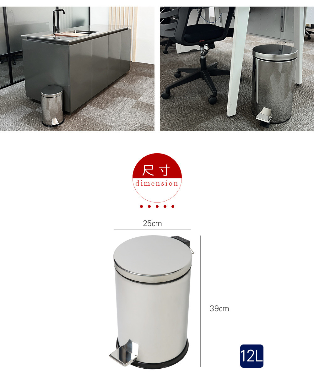 此款垃圾桶使用優質的 304不銹鋼材質,內附不銹鋼一個,容量為8L,是一款輕巧的小型腳踏式垃圾桶,上蓋附有氣密靜音設計,底部含加強穩固設計,使用上重心更穩,外觀使用亮面不銹鋼素材,亮麗外型適合放置客廳、辦公室、廁所。