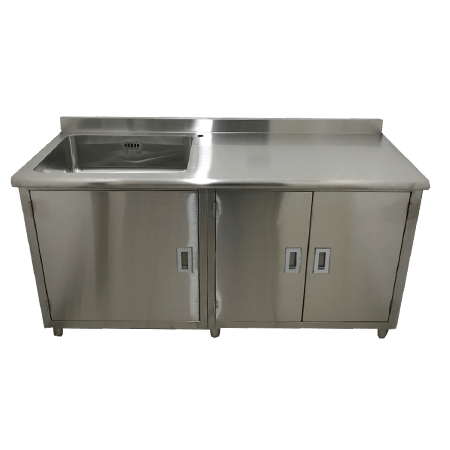 不銹鋼水槽流理臺,採304不銹鋼材質,堅固耐用,防銹耐蝕,下方櫃計體採對開門式設計,方便收納,並安裝擋水牆,避免潑濺,水槽均提供客製化服務,歡迎各單位洽詢。