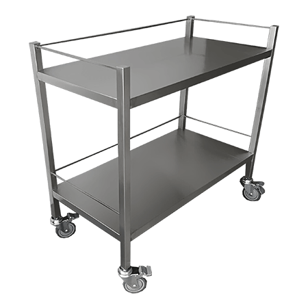 304不銹鋼雙層置物推車,堅固耐用,不鏽鋼材質好清洗,安裝圍邊條,外型簡約美觀。提供各式規格數量訂作,歡迎各單位洽詢。