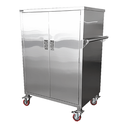 304不銹鋼置物推車,對開式門板設計,堅固耐用,不鏽鋼材質好清洗,外型簡約美觀。提供各式規格數量訂作,歡迎各單位洽詢。