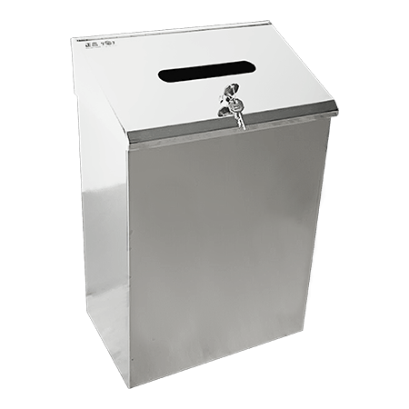此款回收箱採用304不銹鋼材質,適用於ATM廢紙箱,可安裝於牆壁上,內附含有鎖頭,無額外內箱,輕巧好安裝。