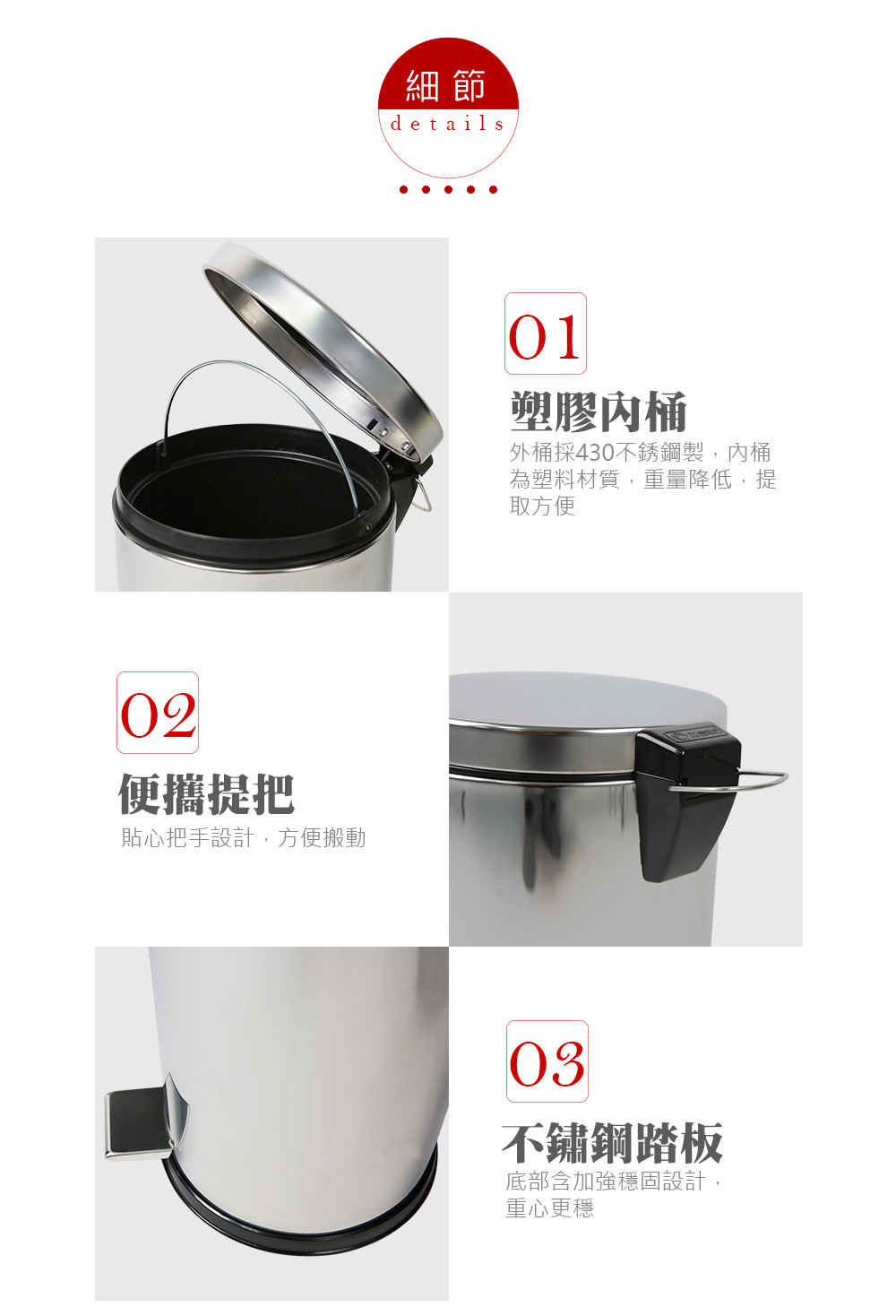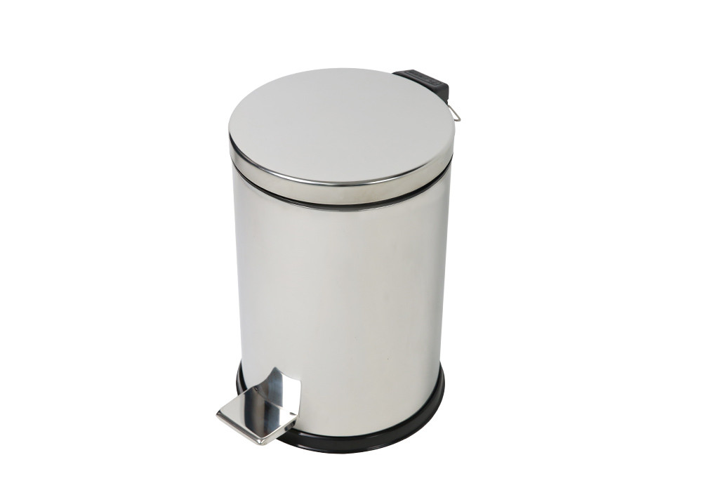 此款垃圾桶使用優質的 430不銹鋼材質,內附PP桶一個,容量為12L,是一款輕巧的小型腳踏式垃圾桶,上蓋附有氣密靜音設計,底部含加強穩固設計,使用上重心更穩,外觀使用亮面不銹鋼素材,亮麗外型適合放置客廳、辦公室、廁所。