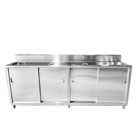 不鏽鋼流理台 TJ-230931,採304不鏽鋼材質,堅固耐用,防鏽耐蝕,客製化單槽式水槽櫃,圓弧式檯面前緣,下方左右拉門。水槽均提供客製化服務,歡迎各單位洽詢。