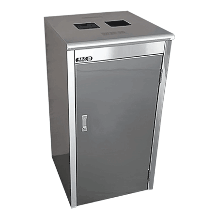 此不鏽鋼分類垃圾桶 YJ-136D為家樂福使用款,外箱304不鏽鋼材質,內桶附有材質較堅固不易破損的耐酸鹼塑膠桶,單一內容量為70公升。上方投入口採方形設計,方便回收瓶裝類,前門板為側開門式,可避免垃圾袋外漏情形。是大型賣場愛用款。