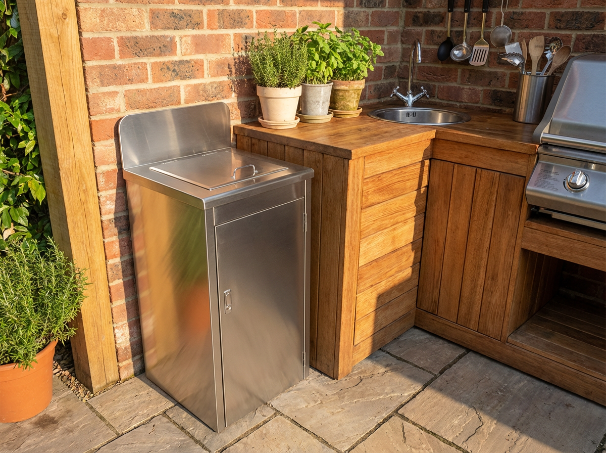 此款不鏽鋼廚餘桶 YJ-136E 採用304不鏽鋼製成,內桶附材質堅固不易破損的耐酸鹼塑膠桶,內容量達70公升。投入口為掀蓋式(斜角),可避免桶內異味飄出,特附有標示牌(高度為17cm),前門板為側開門式,可避免垃圾袋外漏。