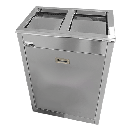 此款不鏽鋼搖擺式二分類垃圾桶 YJ-207SB 內、外箱皆採用304不鏽鋼材質,上方投入口加裝搖板式上蓋,符合人體工學,門板可固定前傾45°角,方便內桶垃圾袋更換,也可避免垃圾袋外露,外型美觀。