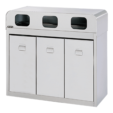 此款不鏽鋼三分類回收桶 YJ-312S採用304不銹鋼材質,上蓋平面式左右圓弧形設計,可預防撞擊受傷。投入口採開放式,使用上能確定垃圾分類使用方便,開放式內桶,垃圾袋外掀式,容量較大,方便收取垃圾。