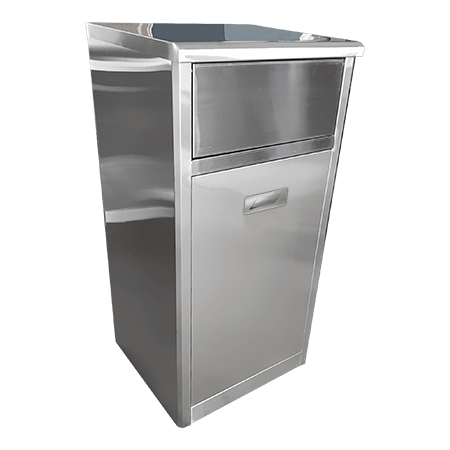此款不鏽鋼搖擺式垃圾桶 YJ-80B 材質為304不鏽鋼,內附不鏽鋼內桶,門板開關為前傾45°式設計,附有投入口推板,能阻隔內外不易滋生蚊蟲及發出異味。