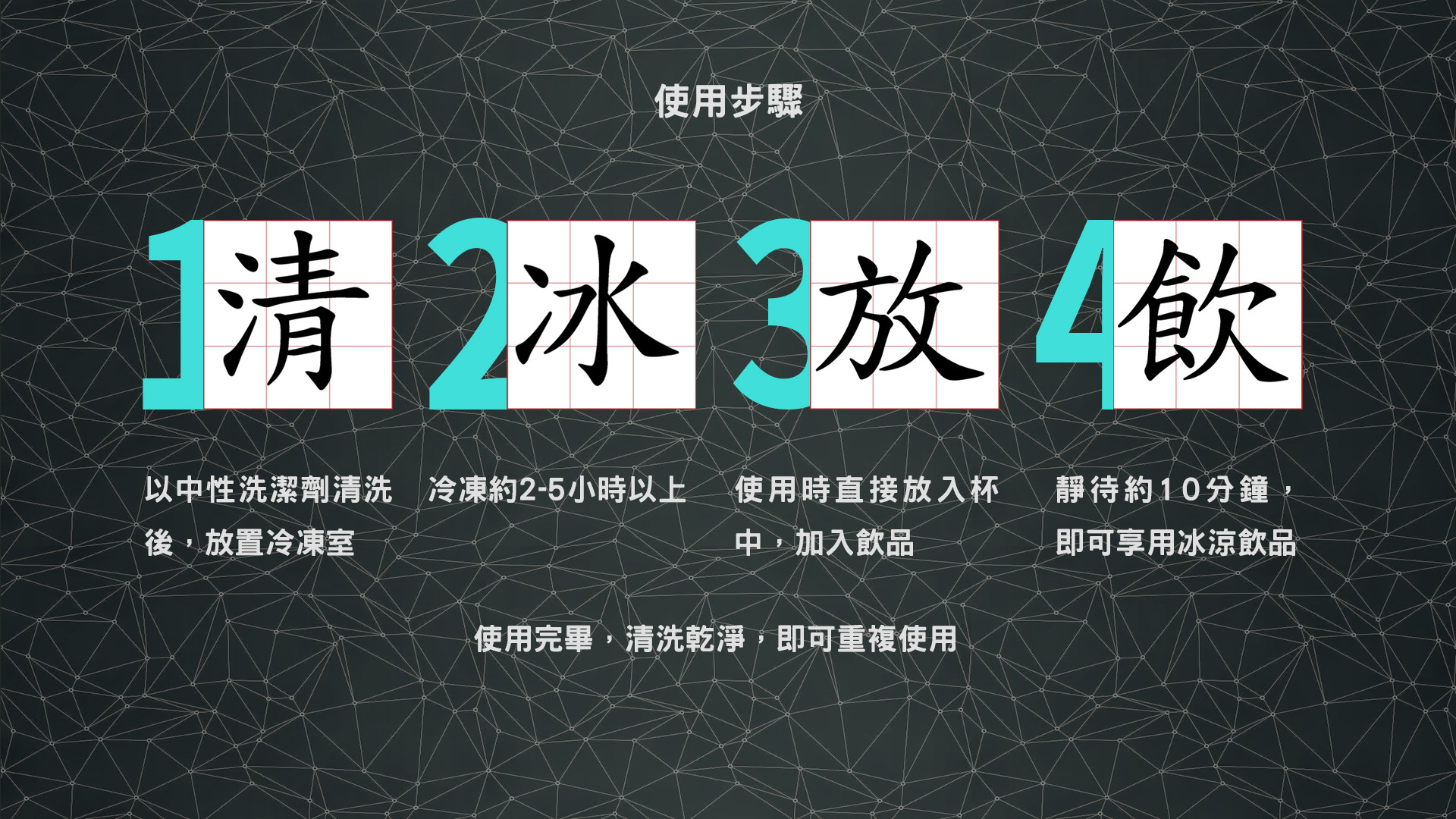 - 使用完畢,清洗乾淨,即可重複使用
