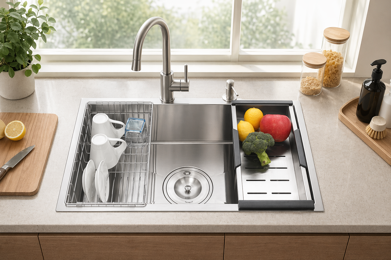 不鏽鋼水槽 YJ-S9487,含大型提籠,清潔便利,堅固耐用,可搭配濾水盆或滴水籃使用。