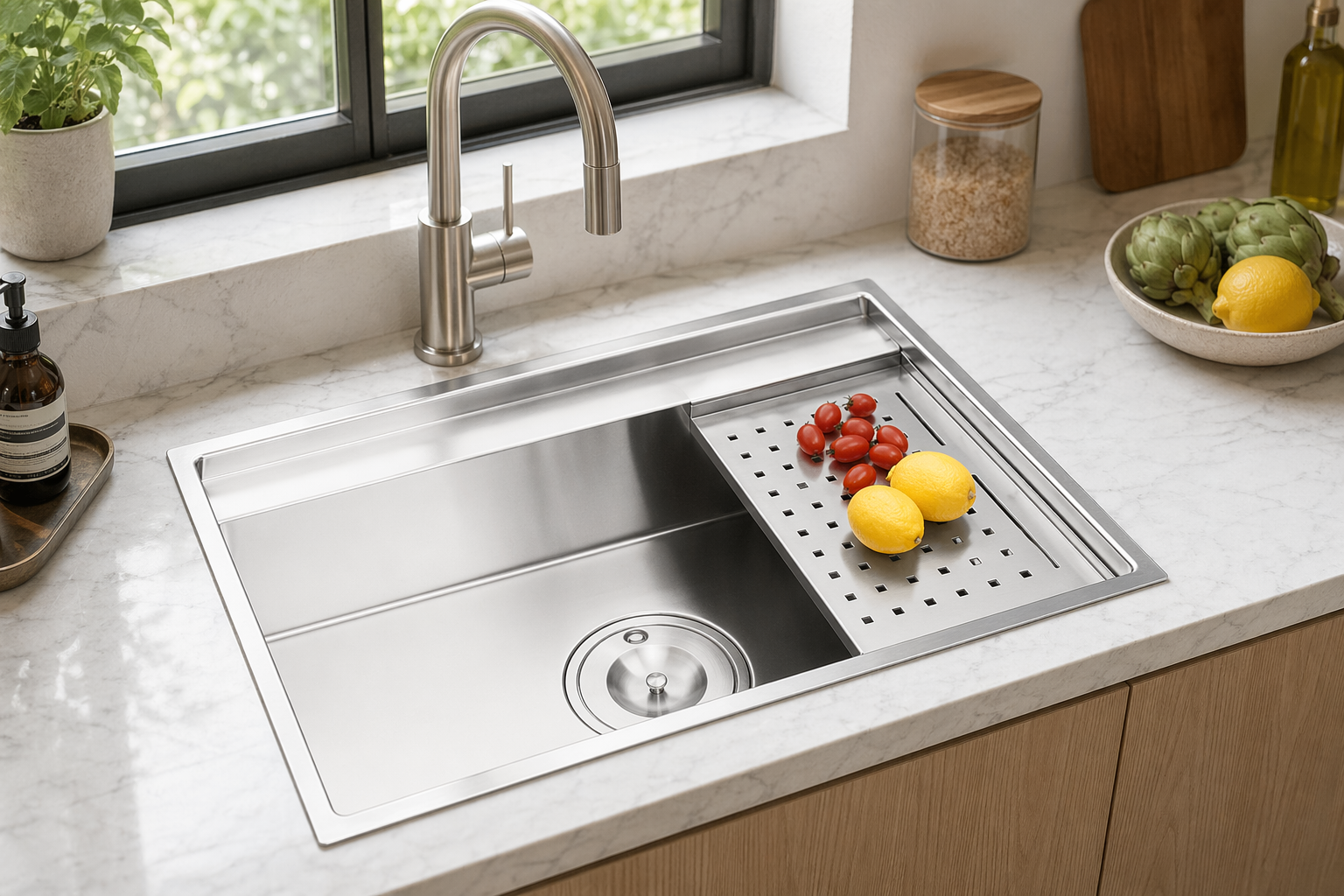 不鏽鋼水槽 YJ-S9775P,含大型提籠,清潔便利,堅固耐用,可搭配濾水盆或滴水籃使用。