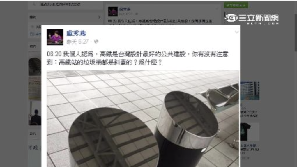 民眾答案百百種,因為垃圾筒用了好幾年從沒想過這問題,但這一黑一灰圓柱體的高鐵垃圾桶全身上下都有秘密。立委盧秀燕就在臉書上發文,高鐵是台灣設計最好的公共建設,考考民眾知不知道為什麼垃圾桶會做成斜面。有人搞笑說要引導雨水,有人說不積灰塵,上頭用鏡面材質做的蓋子,也有人這樣想…高鐵乘客:「避免牠們(老鼠)去吃垃圾在上面會滑下來之類的?」