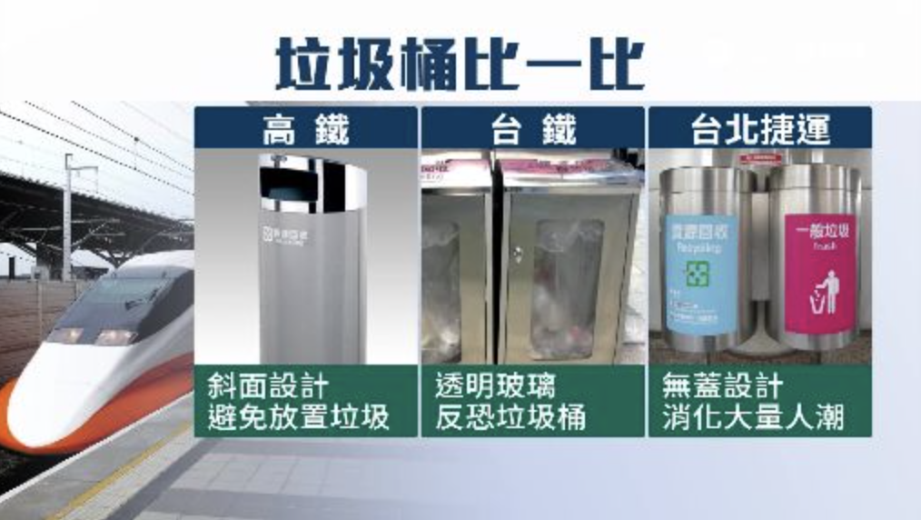 不只時尚也要實用,垃圾桶的筒身特別加高,方便民眾丟垃圾不用辛苦彎腰,比一比,除了高鐵垃圾桶外,台鐵過去曾發生被放置炸彈事件,筒身做成透明設計,可以一眼看清楚內容物,稱作反恐垃圾桶。台北捷運則作成無蓋設計,為了消化大量進出人潮。角落不起眼的垃圾桶不只成了城市美學的一部分,也包含了設計人的巧思。(整理:實習編輯潘玉英)